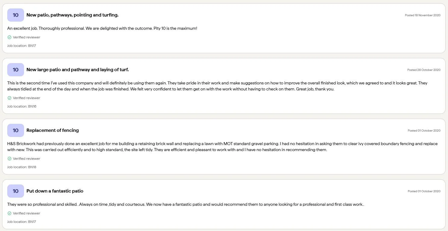 “An A1 job. All fitted perfectly level and pointed to the scheme we asked for. I have some more work to be done and H and S Brickwork and Landscape are coming to do it. On a scale of 1 to 10, it’s 10. All tidied up afterwards and rubbish taken away. Cannot fault them.”