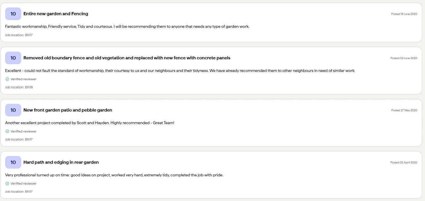 “Exemplary workmanship. Full scores all round. Clean and tidy and very careful in my garden. Polite and a delight to have had such young people working for me. Highly recommend to anyone wishing to have any work done in their garden.”